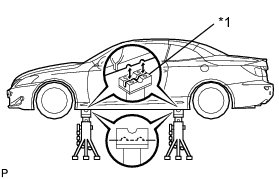 (b) When removing any heavy components like the engine or transaxle, the vehicle center of gravity will shift. To stabilize the vehicle, place a balance weight in a location that will prevent the vehicle from rolling or shifting, or place a transmission jack under the appropriate jack position at the opposite end of the vehicle.
