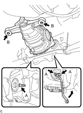 (c) Remove the 2 bolts (B), 2 rear lower differential mount stoppers and rear differential carrier assembly.