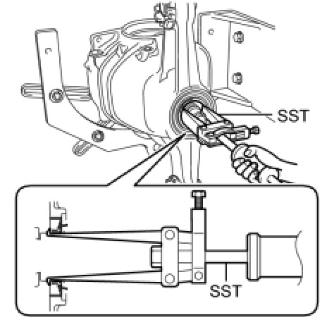 (a) Using SST, remove the rear differential carrier oil seal from the rear differential carrier.