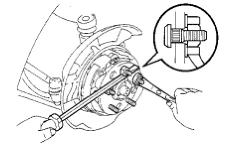 (b) Using a screwdriver or equivalent to hold the axle shaft, install the hub bolt by torquing the nut.