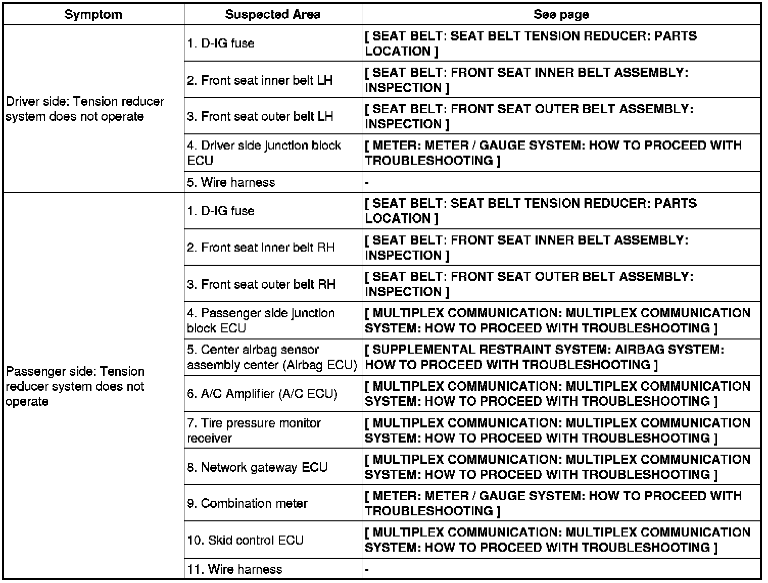SEAT BELT: SEAT BELT TENSION REDUCER: PROBLEM SYMPTOMS TABLE