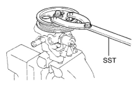 (a) Using SST to stop the pulley from rotating, remove the pulley set nut.