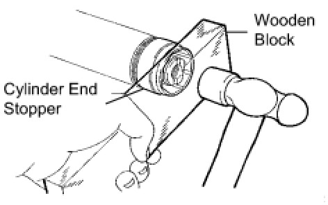(b) Using a wooden block and hammer, tap in the cylinder end stopper until it is tightly installed.