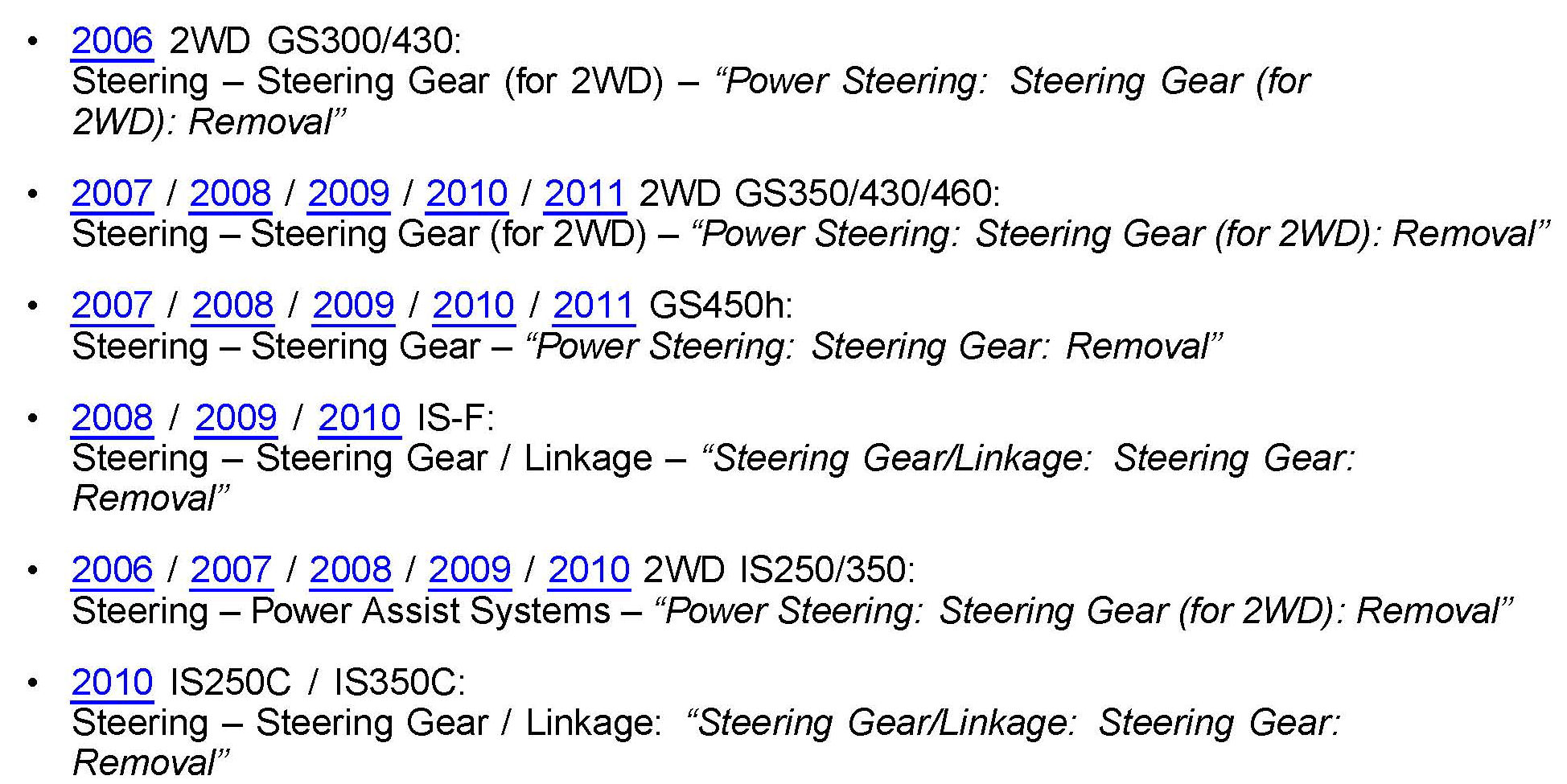 Some Lexus vehicles may exhibit an intermittent non-binding notchy steering feel and/or the steering wheel will not smoothly self-center when driving at highway speeds. This condition may occur when changing lanes or when coming out of long sweeping turns at highway speeds. Please use the following repair procedure to address this condition.