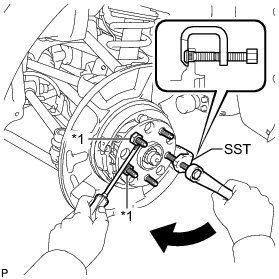 (b) Using SST and a screwdriver or an equivalent tool to hold the rear axle hub and bearing assembly, remove the rear axle hub bolt.