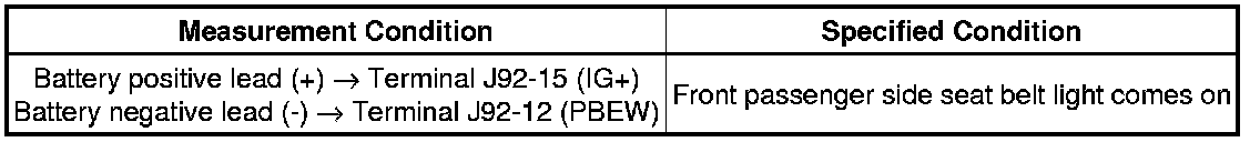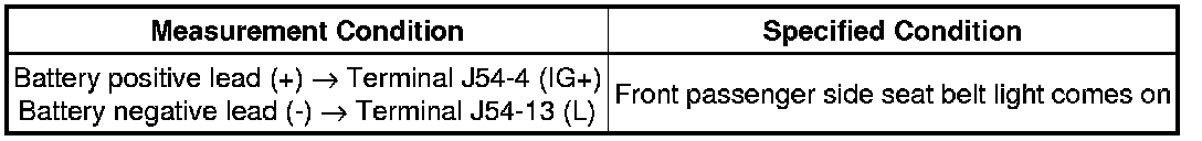 (b) Apply battery voltage from the wire harness back side between the terminals negative lead , and check the lighting condition of the front passenger side seat belt warning light.