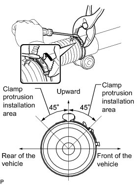 Make sure that the protrusion of the steering rack boot clamp is positioned within the area shown in the illustration.