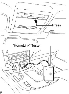 Use the "HomeLink" tester and a tester transmitter for this test. First erase the customer's transmitter code, and then register the tester transmitter code.