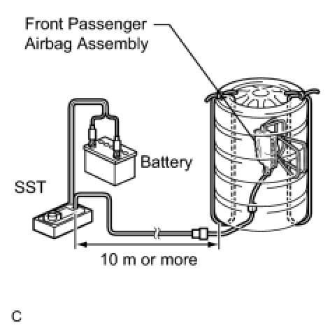When scrapping a vehicle equipped with the SRS or disposing of the front passenger airbag, be sure to deploy the airbag first in accordance with the procedure described below. If any abnormality occurs with the airbag deployment, contact the SERVICE DEPT. of the TOYOTA MOTOR SALES, U.S.A., INC.