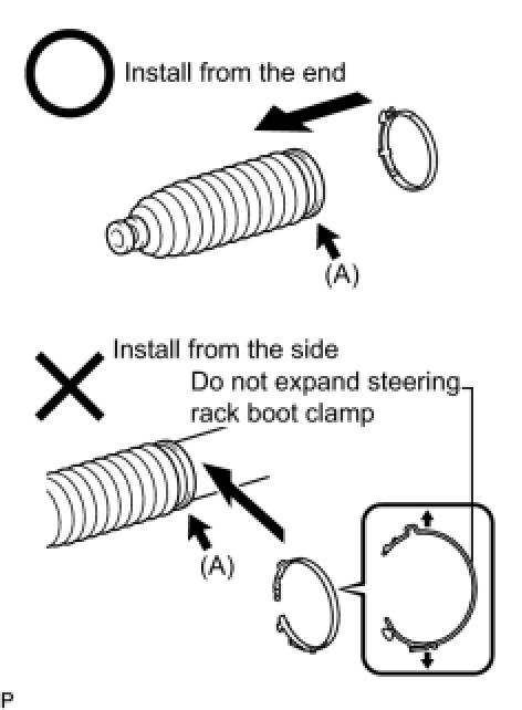 * Tightening force of the steering rack boot No.1 clamp becomes uneven if it is installed after being expanded as shown in the illustration. As a result, rust is caused by water entering from the clearance between the boot and rack housing, causing a malfunction.