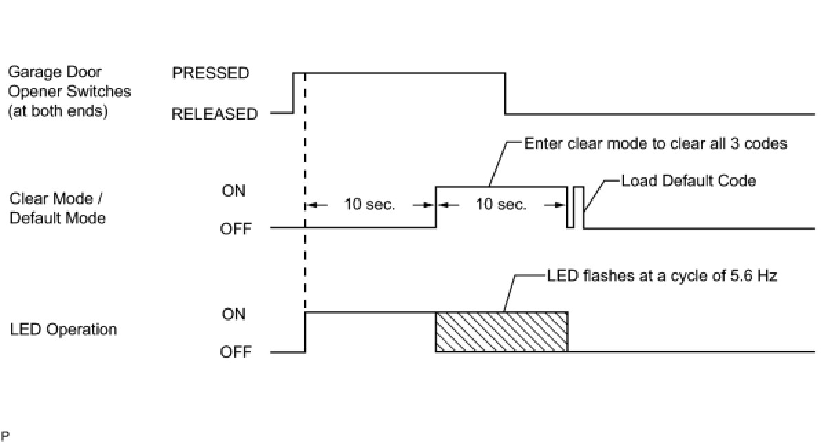 * In some cases, the garage door opener system LED may flash slowly (1 time per second (1 Hz)) as soon as the selected garage door opener system switch is pressed. This indicates that the system is ready or "listening" for a code from a handheld transmitter. Continue to hold the switch and perform the procedure again from step 3.
