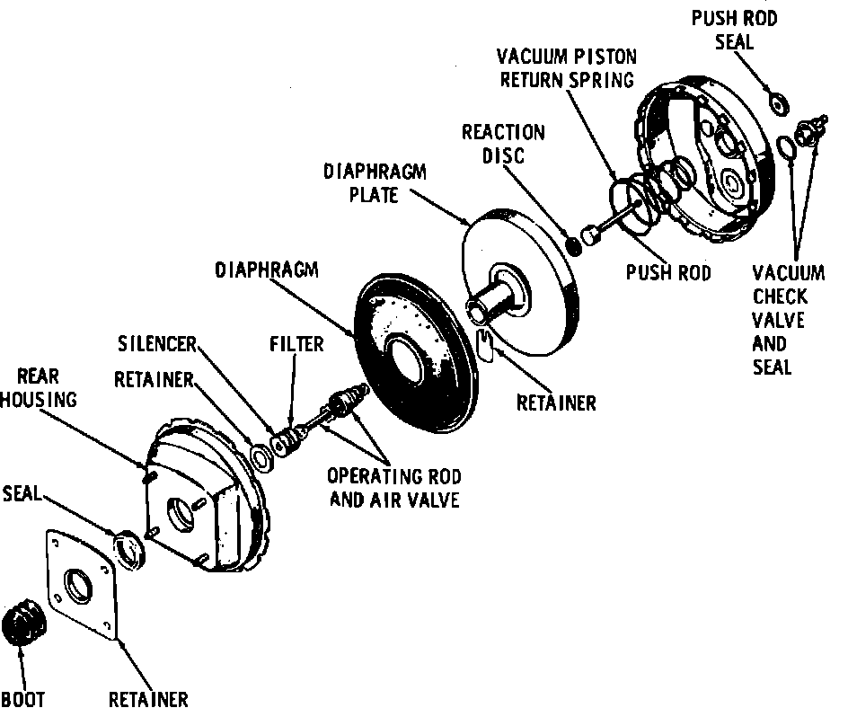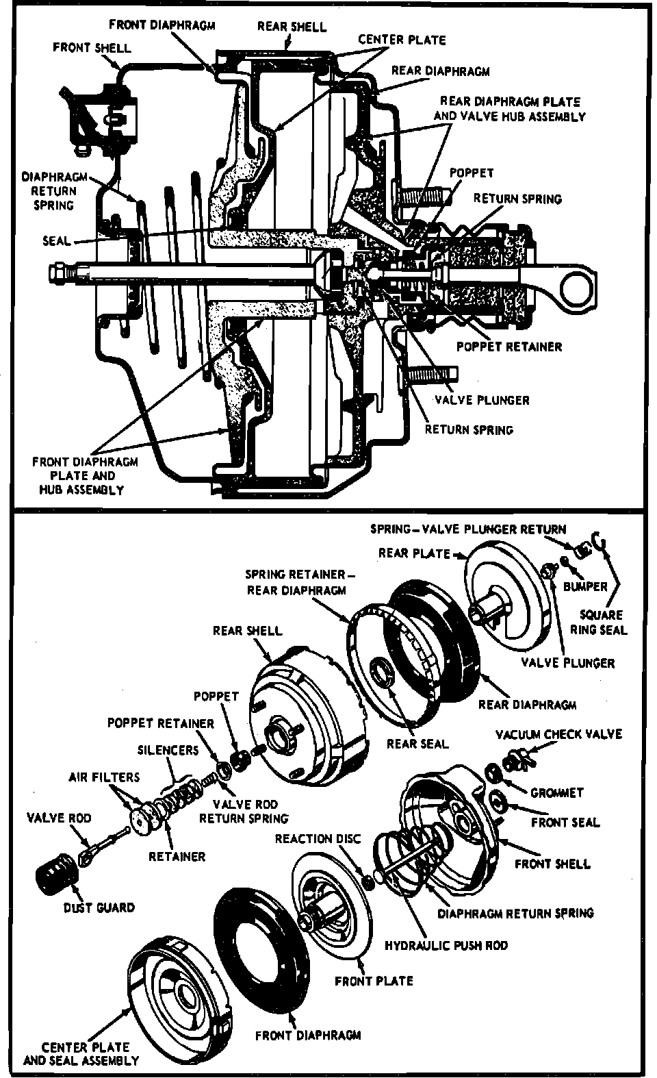 The vacuum suspended diaphragm type units utilize engine manifold vacuum and atmospheric pressure for its power. It consists of three basic elements combined into a single power unit. The three basic elements of the single diaphragm type are: