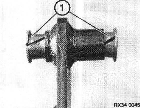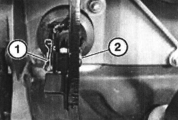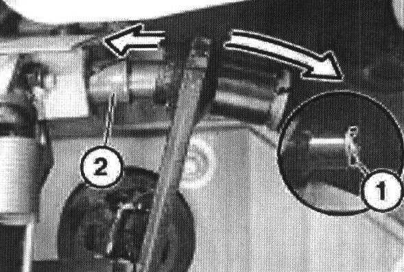 Remove clip (1) holding pedal to pivot shaft. Pull bearing bushing (2) out of brake pedal. Twist brake pedal downwards off bearing block in direction of arrow.