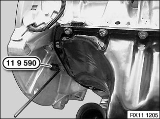 11 9 590 Slide in special tool in direction of arrow and block crankshaft.