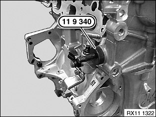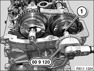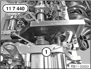 Secure special tool 11 7 440 with bolts (1) to cylinder head.