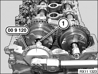 Position special tool 11 7 440 on the mounting flats of the intake camshaft and twist with special tool 32 2 100 if necessary.