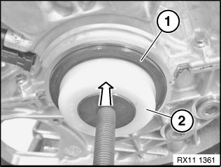 Push PTFE ring (1) in direction of arrow over support ring (2) onto crankshaft.