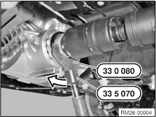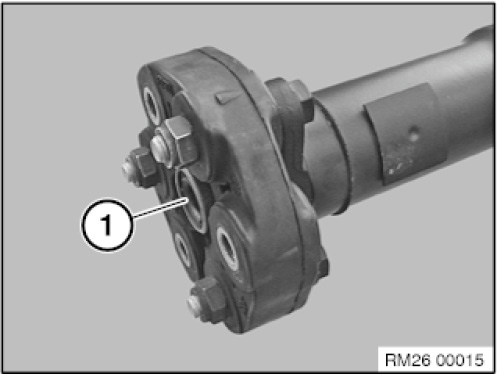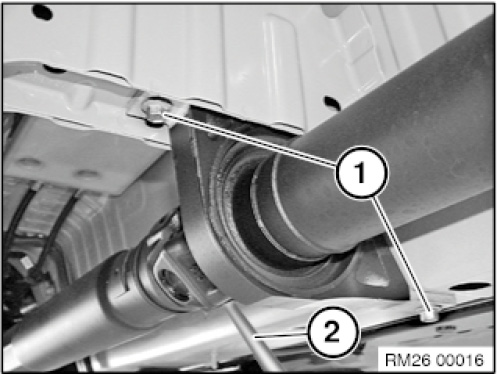 Using a suitable tool (2), secure propeller shaft at centre universal joint against turning.