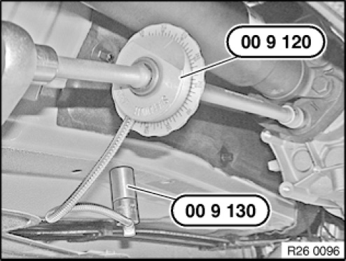 Secure angle of rotation special tool 00 9 120 with magnets 00 9 130 to vehicle underbody and screw down further according to angle of rotation.