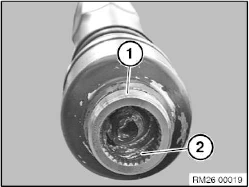 Clean insert collar (1) on flange nut and gearing on bevel pinion (2).