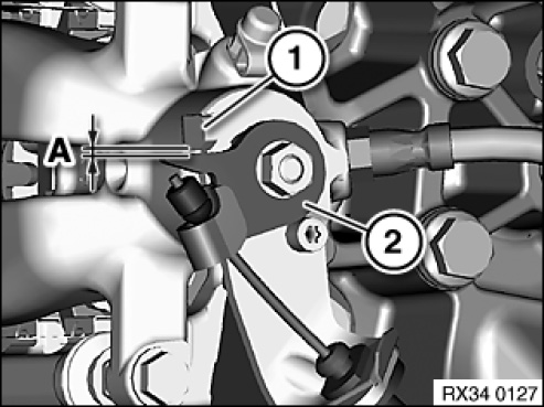Screw in adjusting nut on parking brake lever until a gap (A) of 0.5 1.5 mm between parking brake lever (2) and stop (1) is set at brake calipers.
