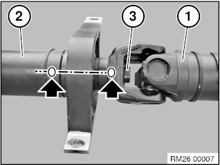 Mark front propeller shaft (1) and rear propeller shaft (2) in one plane.