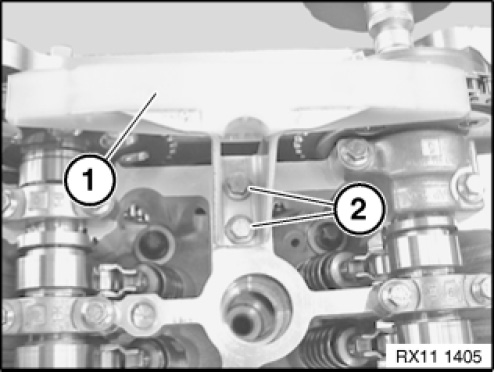 Secure special tool 11 7 440 on the cylinder head with screws (1).