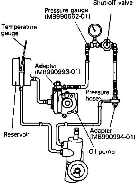 The following procedures require the following special tools to complete. An oil pressure gauge assembly tool No. MB990662-01, a power steering oil pressure gauge pump side adapter tool No. MB990993-01 and a power steering oil pressure gauge hose side adapter tool No. MB990994-01.Fig. 1 Pressure Gauge Installation. Diamante, Eclipse, Expo, Galant, Montero, Mirage & 3000GT: