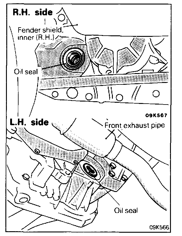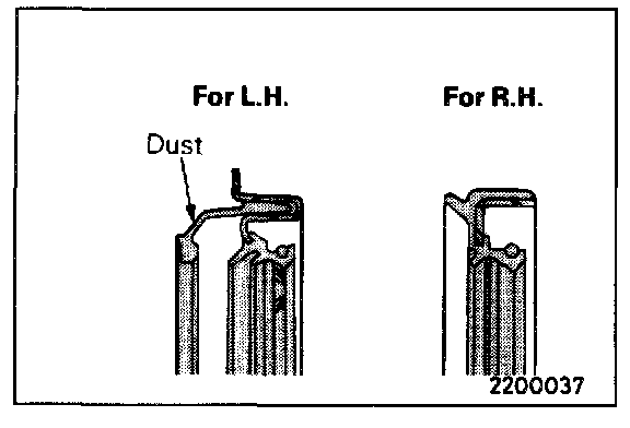 Using the special tool, tap the oil seal into the transaxle. Note that there are two types of oil seals, one for R.H. and the other for L.H., and the shape of each type is different, as shown.