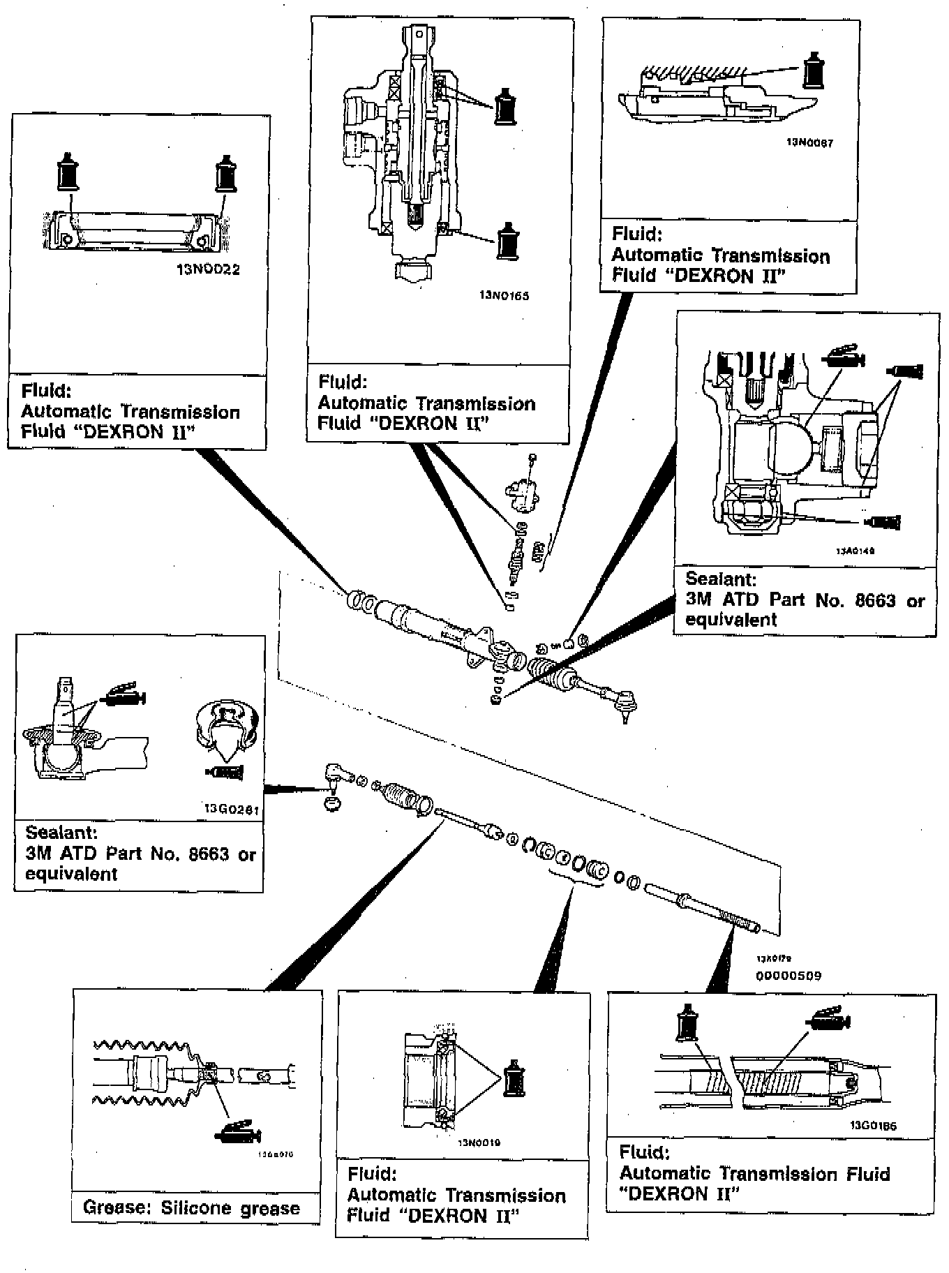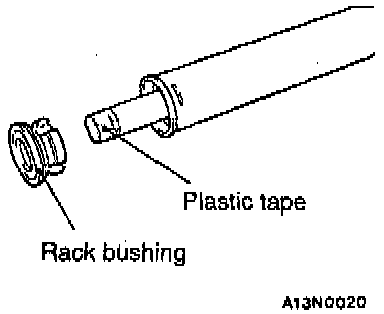 Wrap the rack end with plastic tape, apply a coating of the specified fluid, and then install the rack bushing and rack stopper.