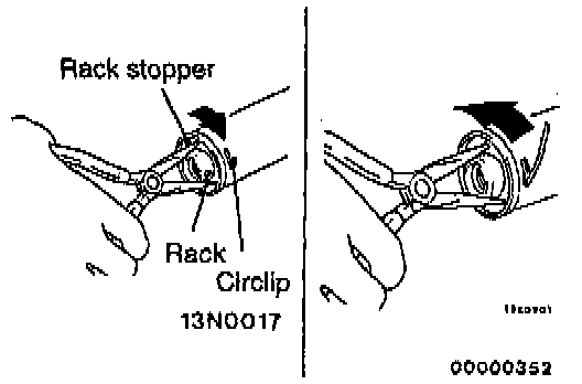 CAUTION: Note that if the rack stopper is first turned counterclockwise, the circlip will get caught in the slot in the housing and the rack stopper will not turn.