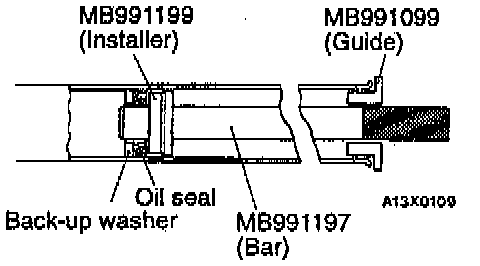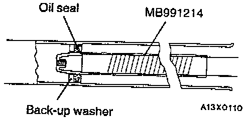 2. Using the special tools, press the back-up washer and the oil seal into the rack housing to the specified position (where the upper surface of press-in guide coincides with the stepped part of the press-in tool).