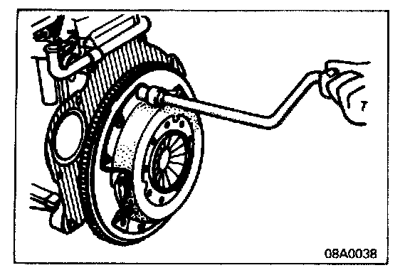 Diagonally loosen bolts which attach clutch cover to flywheel. Back off bolts in succession, one or two turns at a time, to avoid bending cover flange.