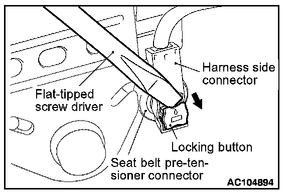 NOTE: Once disconnected from the floor wiring harness, both electrodes of the seat belt pre-tensioner connector short-circuit automatically. This prevents the seat belt pre-tensioner from accidental deployment caused by static, and etc.