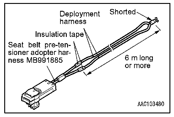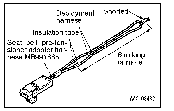 2. Prepare two operation harnesses longer than 6 m to connect with the pretensioner adapter harnesses (MB991885) and insulate the connections with tape. Furthermore, connect one end of the operation harnesses with the other to short-circuit.