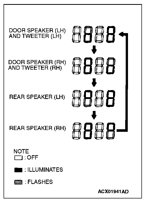 4. If a button other than the memory select "6" button and "EJECT" button is pressed, or the ignition switch is turned to "LOCK" (OFF) position, you will exit from the speaker test mode.