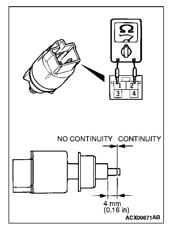 2. There should be no continuity between the terminals when the plunger is pushed in as shown. There should be continuity when it is released.