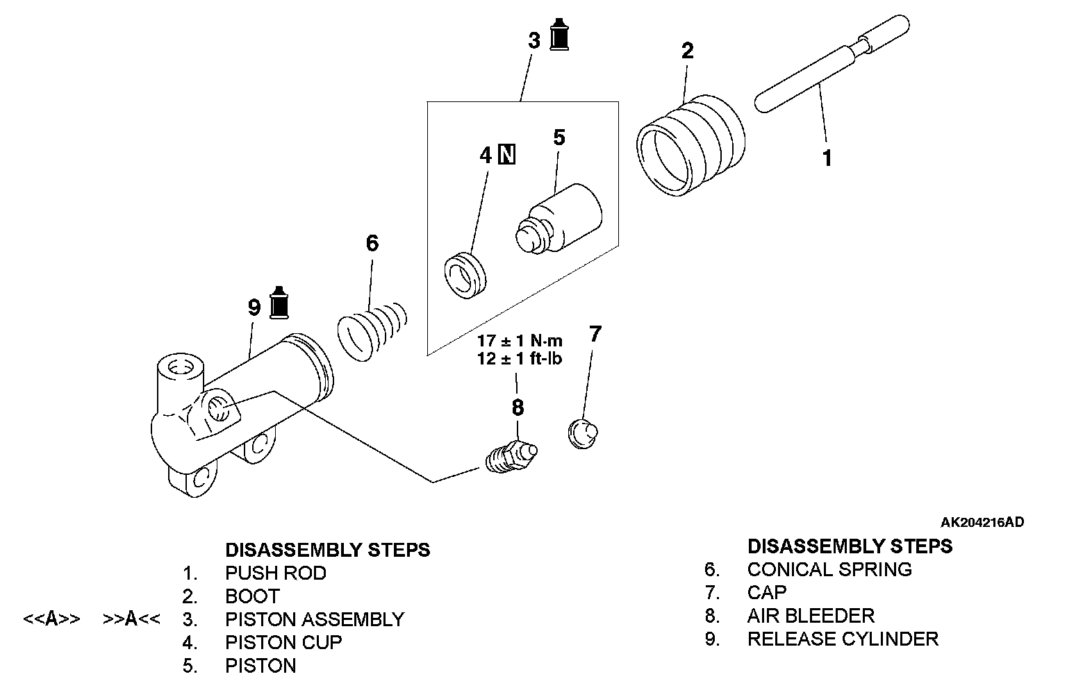 1. Apply brake fluid SAE J1703 (DOT3) to the piston cup and inner surface of the release cylinder.
