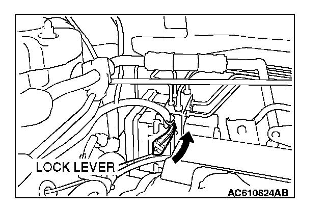 Move the lock lever of the TCL/ASC-ECU connector as shown in the illustration, and then disconnect the harness connector.