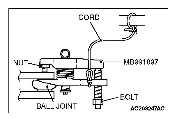 ^ Do not remove the nut from ball joint. Loosen it and use special tool MB991897 to avoid possible damage to the ball joint threads.