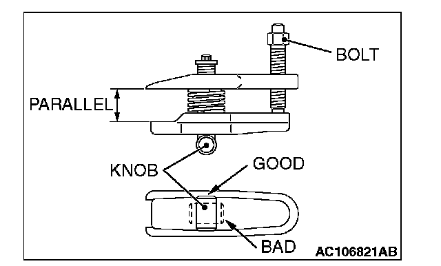 2. Turn the bolt and knob as necessary to make the jaws of special tool MB991897 parallel, tighten the bolt by hand and confirm that the jaws are still parallel.
