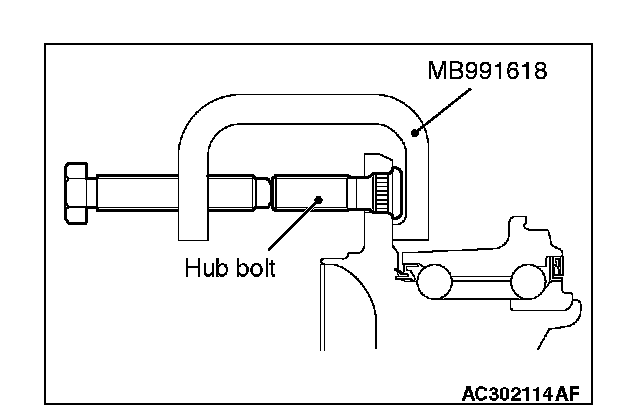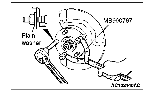 4. Install the plain washer to the new hub bolt, and install the bolt with a nut while holding the hub with special tool MB990767.