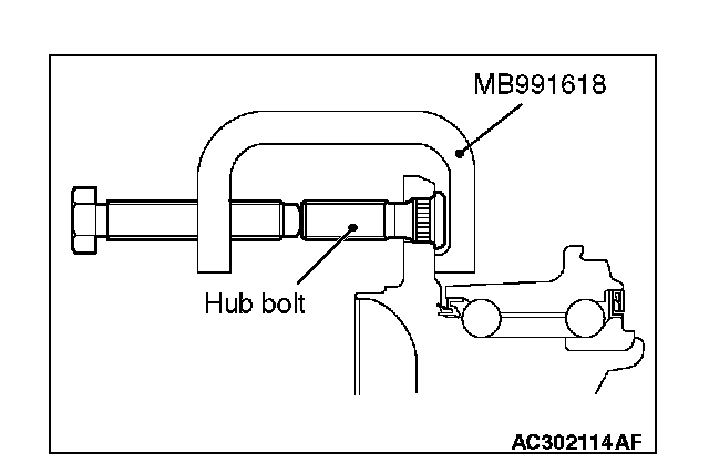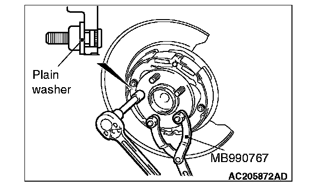 4. Install the plain washer to the new hub bolt, and install the bolt with a nut while holding the hub with special tool MB990767.