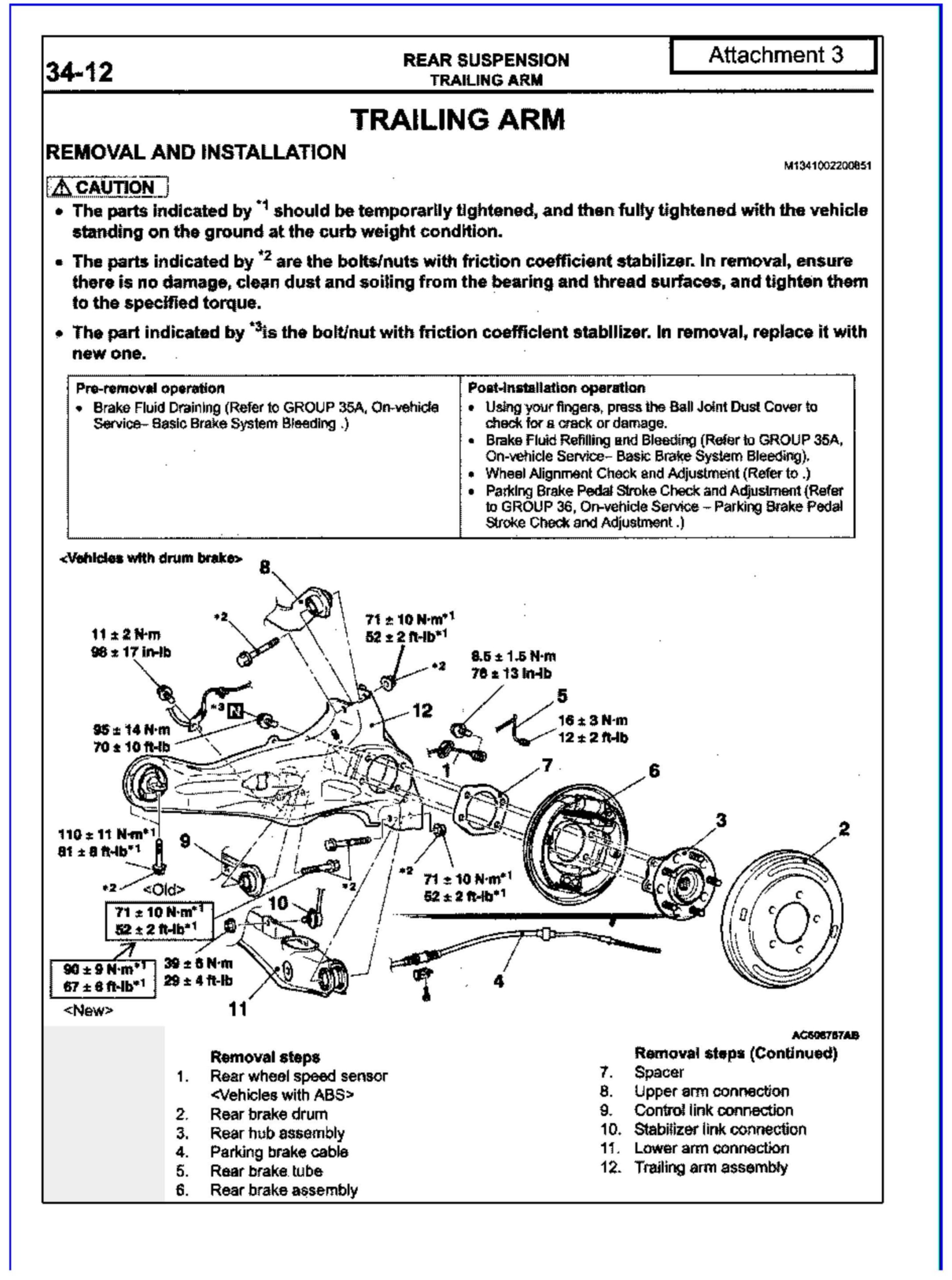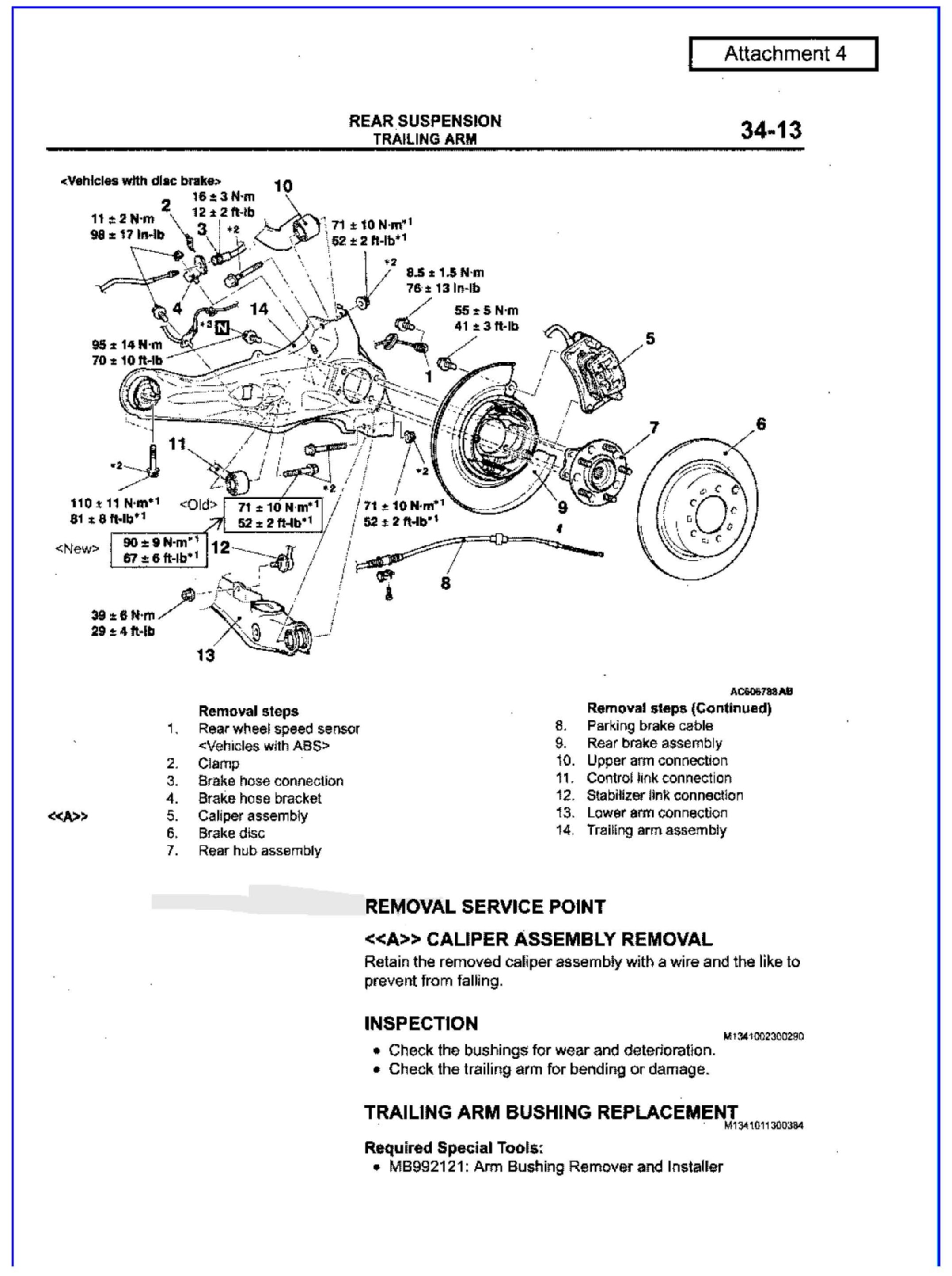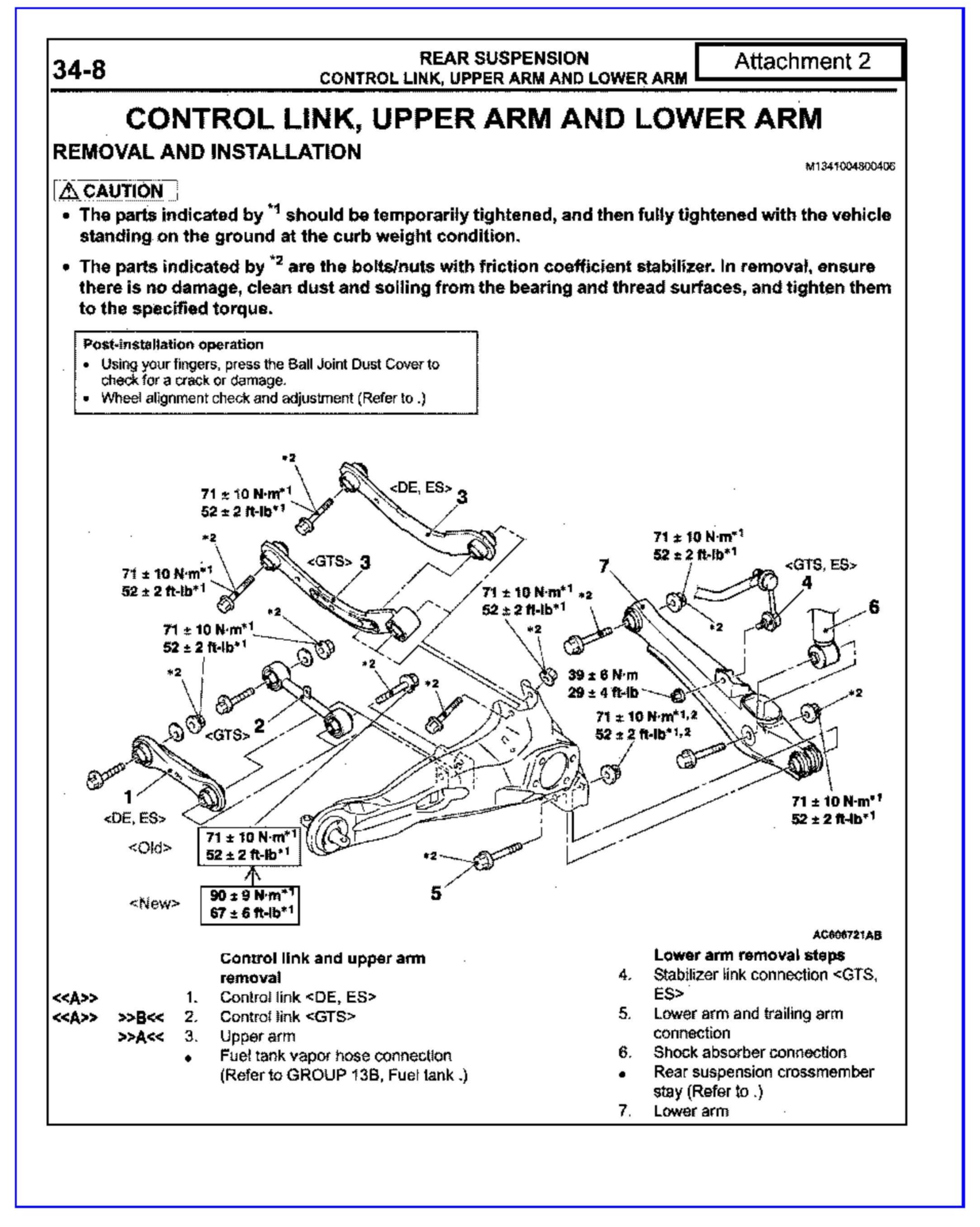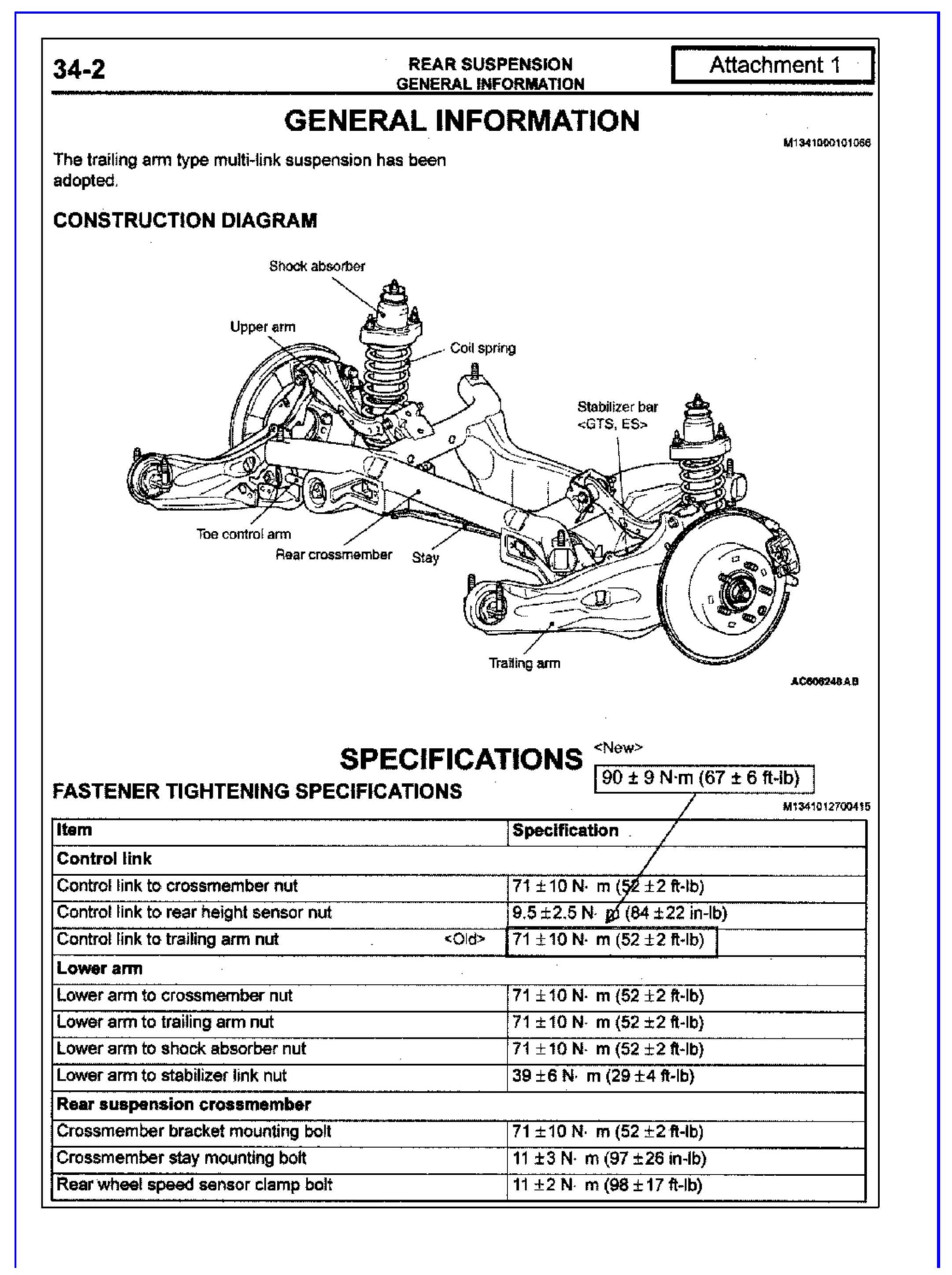 The tightening torque for the parts of the rear suspension are changed in the applicable Service Manual. This Service Bulletin contains the changed tightening torque.