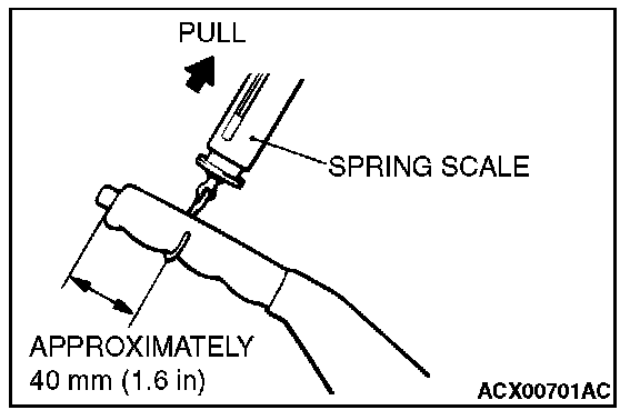 2. Hook a spring scale onto the center of the parking brake lever grip and pull it with a force of 98 - 147 N (22 - 33 pounds) in a direction perpendicular to the handle.