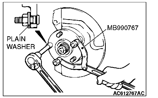 3. Install the plain washer to the new hub bolt, and install the bolt with a nut while holding the hub with special tool MB990767.