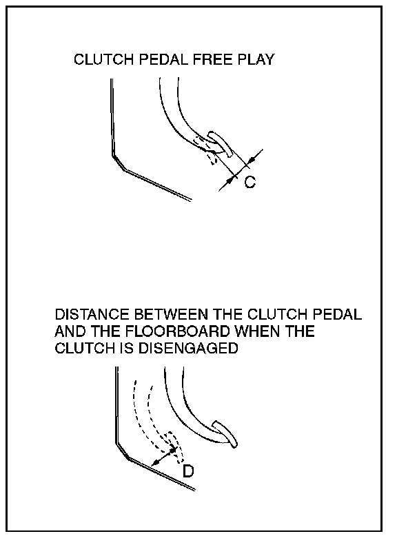 6. After the adjustments, confirm that the clutch pedal free play (measured at the face of the pedal pad) and the distance between the clutch pedal (the face of the pedal pad) and the floorboard when the clutch is disengaged are within the standard value ranges.