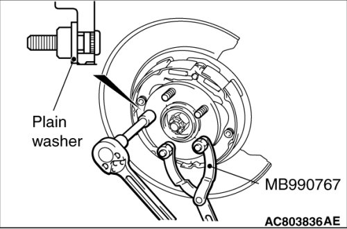 3. After fixing the hub using special tool MB990767, install the plain washer to the new hub bolt, and tighten the bolt with a nut.