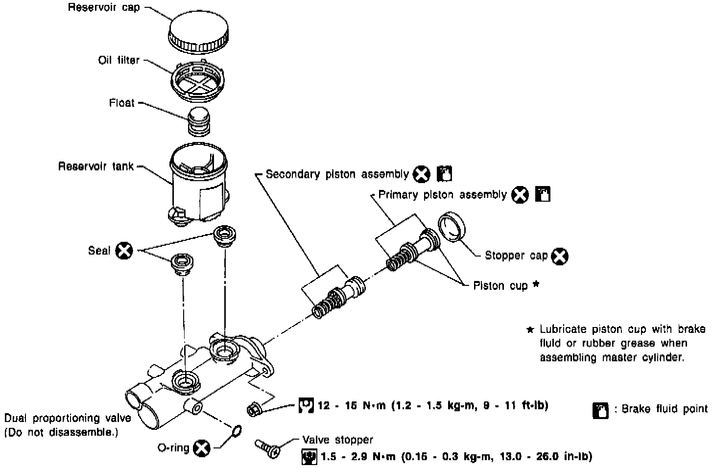 Refer to Fig. 12, for master cylinder overhaul procedures, noting the following: