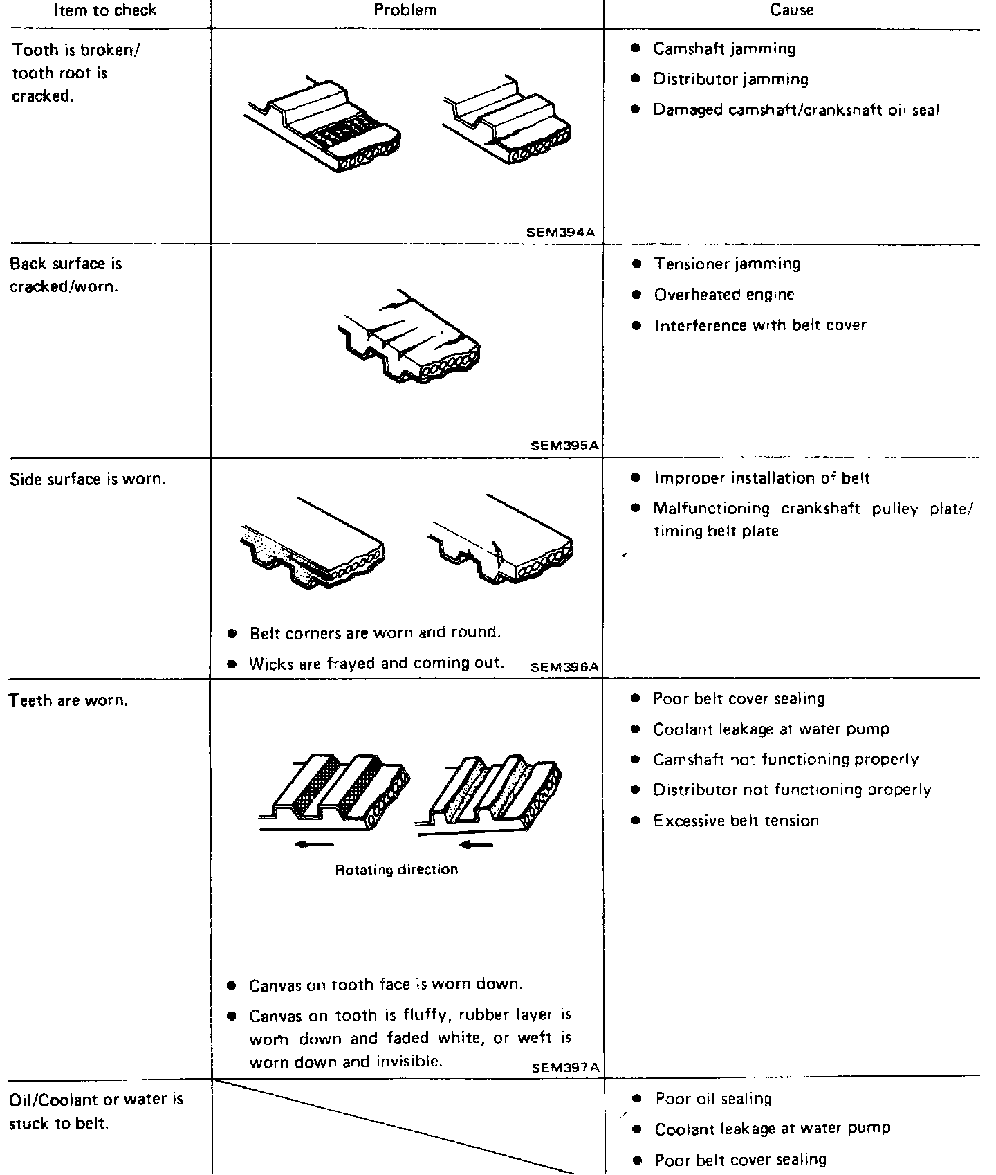 Visually check the condition at timing belt. Replace if any abnormality is found.